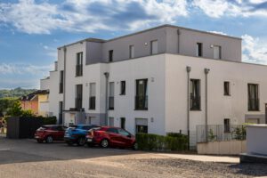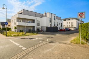 In dem neu erschlossenen Wohngebiet befindet sich das freistehende Mehrfamilienhaus.